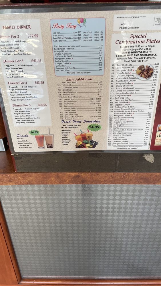 “ We've been ordering from here for years and it's never disappointed but the last 2 times the food has been off. No green onions in the fried rice and today my orange chicken is overcooked. I really don't want to find another place so I'll give it one more try. The people are very nice inside and the fruit smoothies are great. Don't let me down guys !! ”
